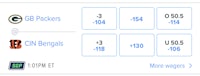 In a battle of division leaders, we get to see a young up and coming star take on one of the best of all time to do it. This should be a fun game, but the Packers are too well rounded, deep, and strong for the Bengals, who are 3-1 but have played very weak teams thus far (Vikings, Steelers, and Jaguars). They barely beat these horrible teams, and their one loss is to the Bears who are also bad. The Packers are clearly a much better team and have looked fantastic in their last 3 since losing to the Saints on opening day, and I definitely think they continue that against a young team, especially on a beautiful day where weather is ideal for Rodgers to do his thing. I expect the Packers to win this win by 10 points, and the Bengals to struggle against a good and experienced Packers defense. Take the Packers -3 and under 50.5 total points.